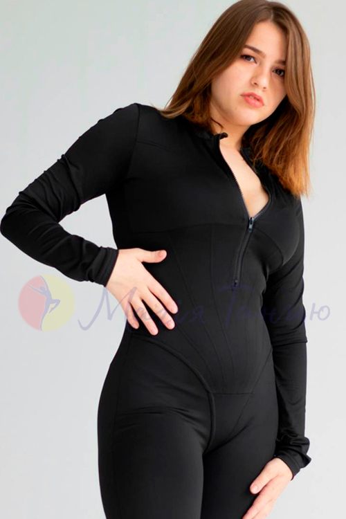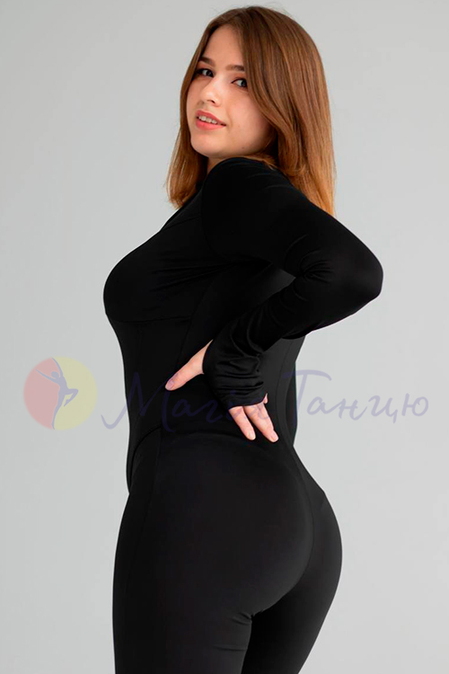 Облягаючий чорний комбінезон для танців на високих підборах. Він чудово структурує силует, завдяки блискавці робить акцент на бюсті. Комбінезон з довгим рукавом має прорізи для пальців, тому рукава не будуть самовільно підстрибувати під час танцю. Також це зручно для тих, хто танцює з реквізитом у руках чи використовує пілон.