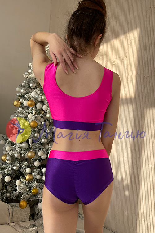 Топ для пол денс маєчкою має широкі лямки, які не зісковзують з плеча. Трусики зі збіркою на широкій резинці слугують йому гармонійним доповненням.