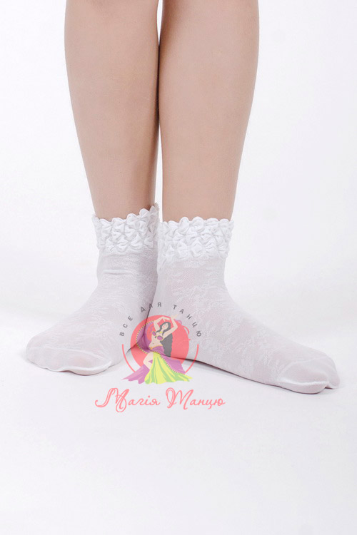 Дитячі шкарпетки білосніжного кольору для виступів бально-спортивної програми. Шкарпетки мають не яскраво виражений малюнок, резинка широка у вигляді збірки. Шкарпетки виглядають на ніжках юних танцівниць дуже ніжно та красиво. Також білі шкарпетки гарно пасуватимуть до шкільної форми.