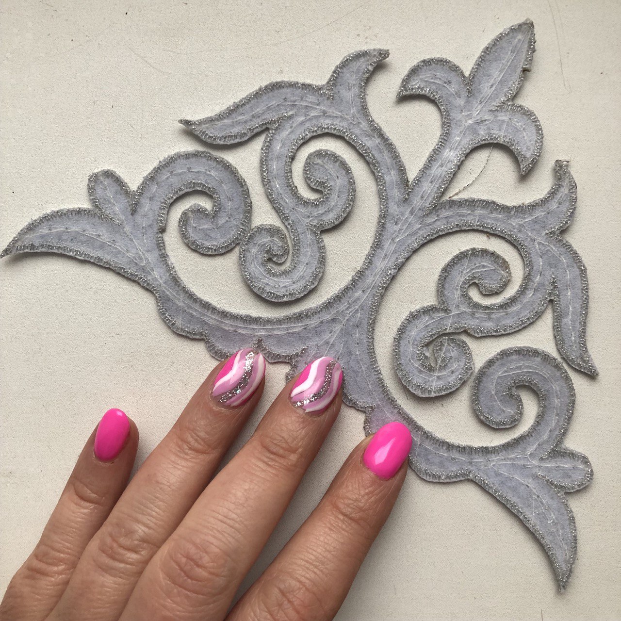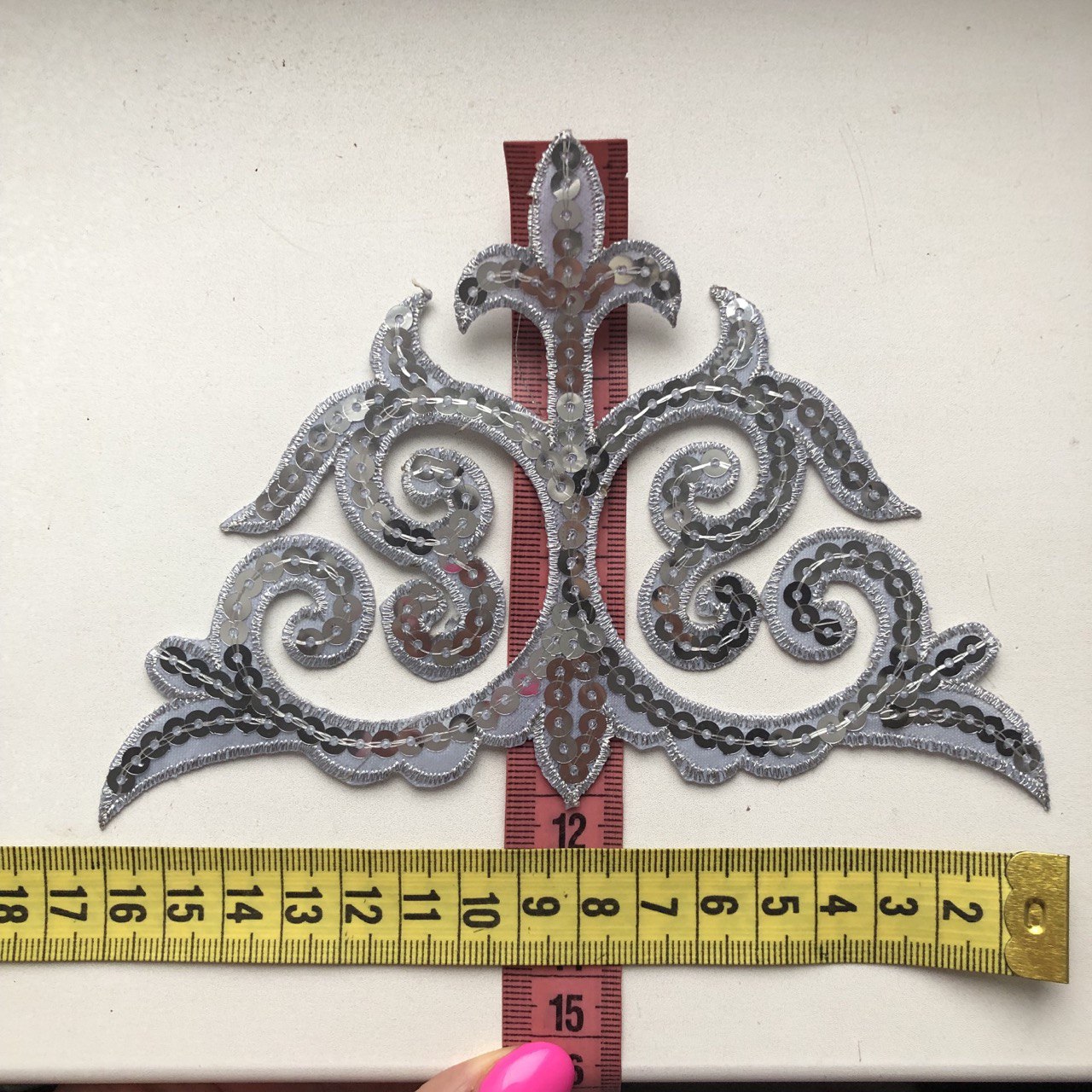 Аплікація з пайєтками на клейовій основі. Прекрасна фурнітура для оздоблення вашого костюму для східних танців. Ширина аплікації - 23 см, висота - 8 см. Обов'язково перевірте, чи підходить вам розмір аплікації, тому що на фото аплікації виглядають однакового розміру, а вони є менші і більші. Готові вироби виглядають красиво і витончено. Аплікацію необхідно приклеїти паром вашої праски. Є різні види, моделі, розміри.