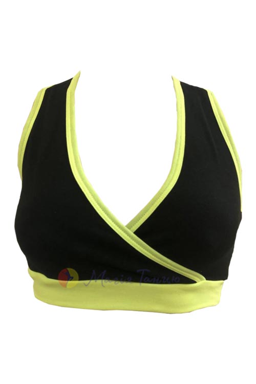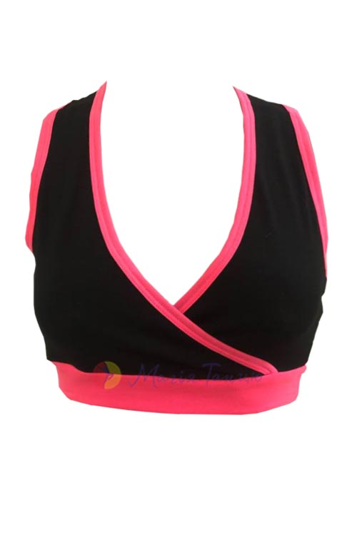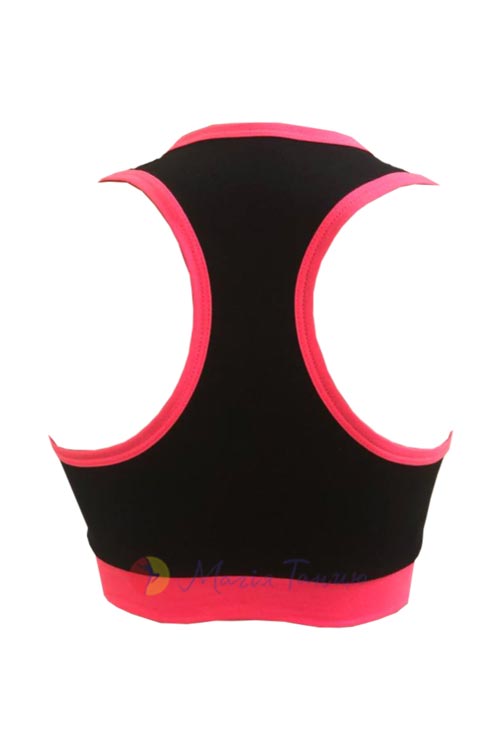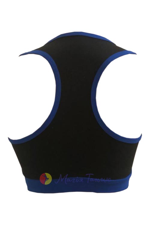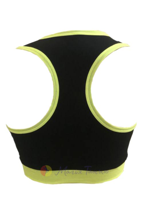 Чорний топ з кольоровим кантом для активних дівчат. Модель без рукавів, лопатки залишаються відкритими, тому в такому топі зручно виконувати рухи руками будь-якої амплітуди. Ви легко підберете до нього шорти, лосини чи велосипедки з асортименту Магії Танцю.