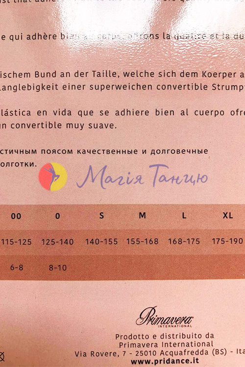 Балетне трико Pridance легко обрати за таблицею розмірів на упаковці (дивіться фото 3). Наприклад, розмір 0 — на зріст дитини 125-140 см, а L — це трико для дорослих, які мають зріст 168-175 см.