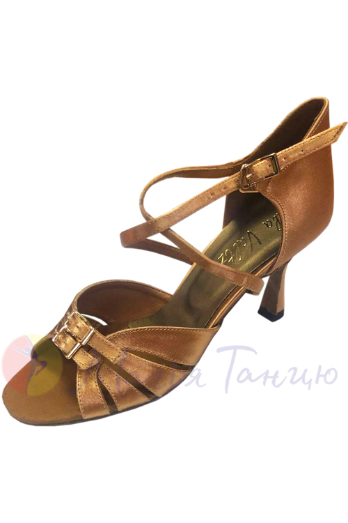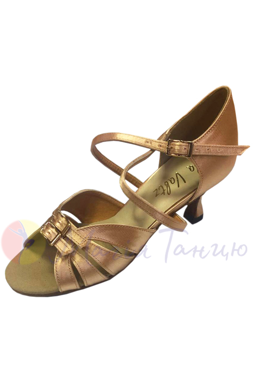 Жіночі бальні туфлі для латини відтінку засмаги. Можна обрати цю модель з підборами висотою 5 см або 7 см. Жіноче бальне взуття Gala Valtz краще підходить на вузьку стопу. Воно ідеально прилягає та надійно тримається під час танцю.