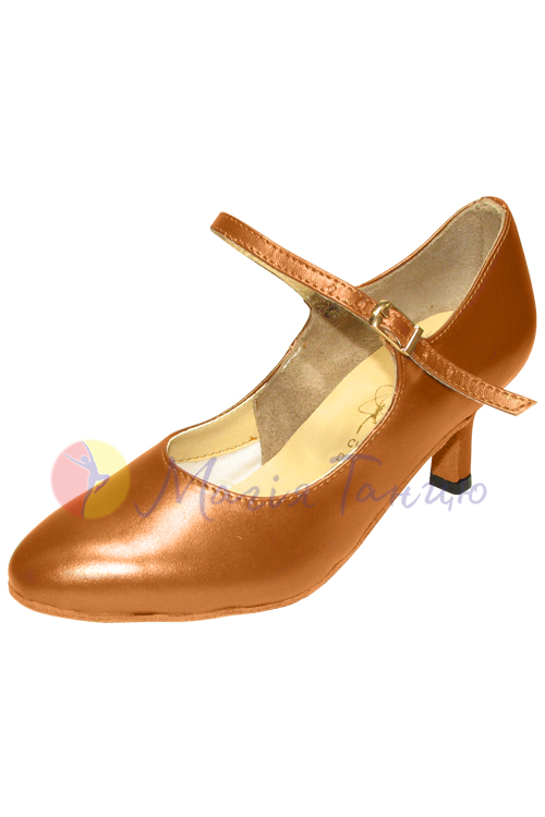 Виконані з натуральної шкіри коричневого кольору. Підходять для бальної програми, вальсу, танго. Висота підбору 5 см,7 см, стійкий до навантажень за рахунок металевого посилювача, який знаходиться всередині підбору. Туфлі мають також і ремінець для надійнішої фіксації ноги у взутті. В нашому магазині представленні розміри від 22 (35) до 26 (40).